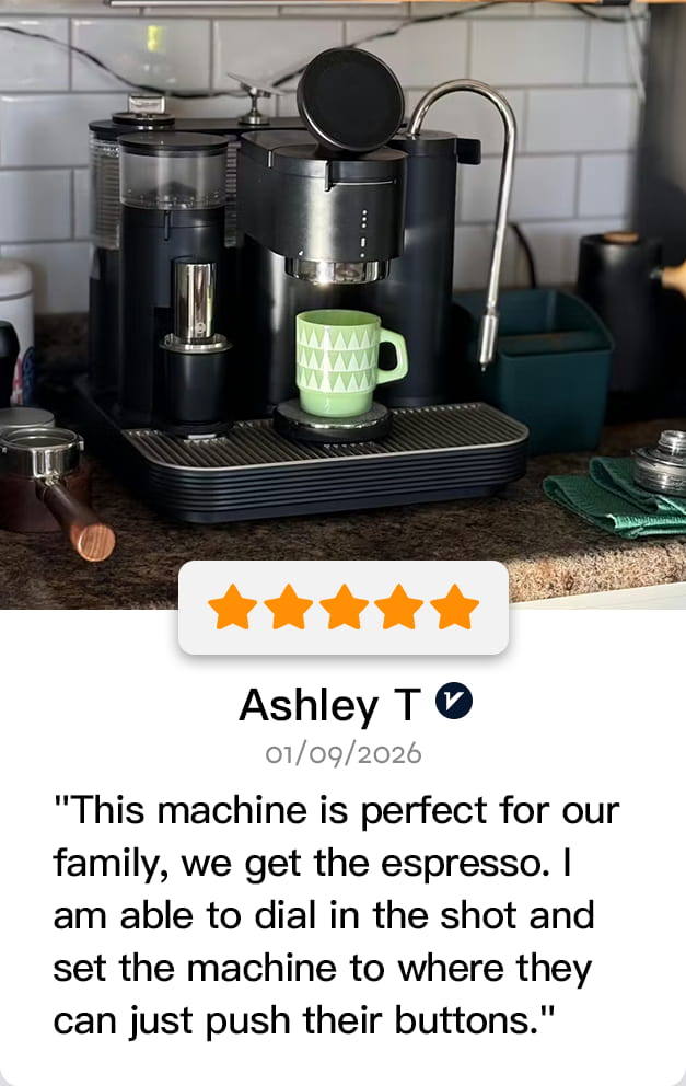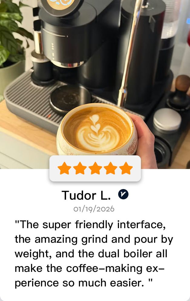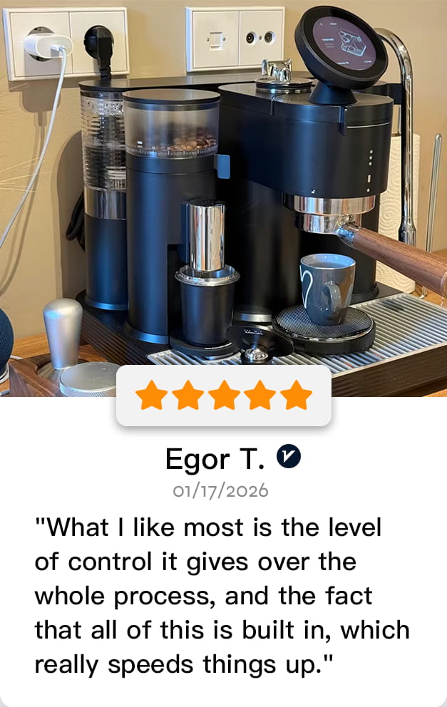 Co-développé avec Timemore, le système de réglage à 30 crans est spécifiquement optimisé pour l’espresso. Réglages précis, reproductibles et stables — une machine tout-en-un conçue pour répondre aux exigences de l’extraction commerciale à la maison.