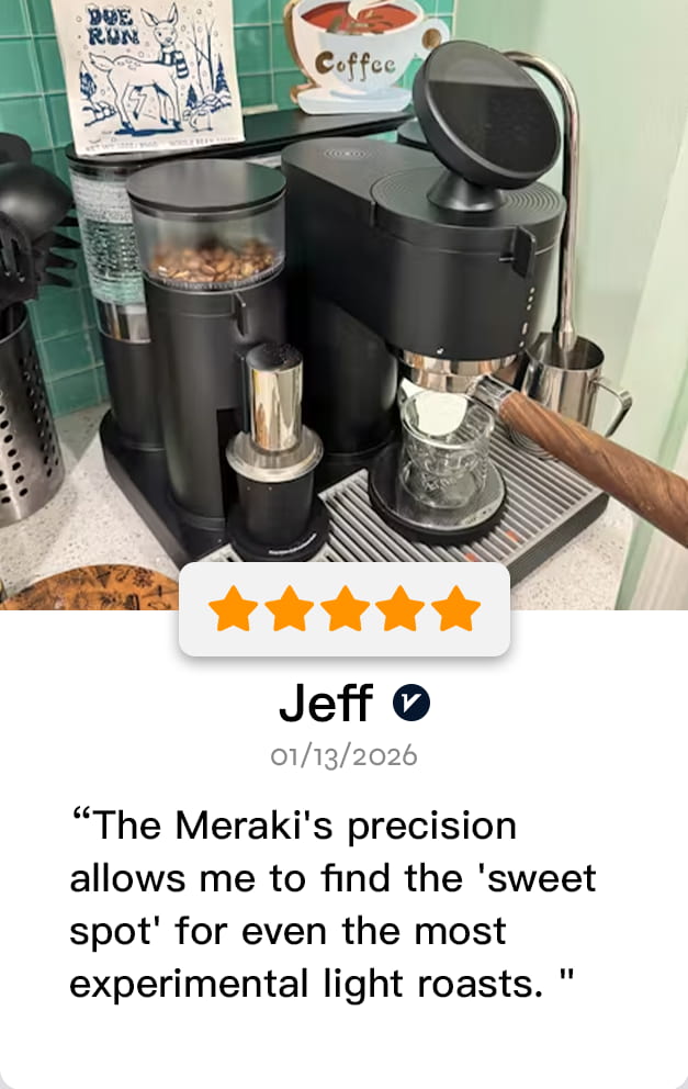 Fini les boutons indéchiffrables et les manuels complexes. Le design primé de Meraki intègre un écran tactile haute définition éclatant qui vous guide comme un barista personnel — parfait même pour les grands débutants.